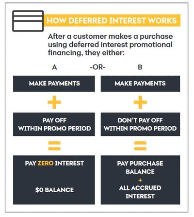 A Deferred Interest Promotion is an offer that may be available on your purchase. With this offer, interest accrues (adds up) on your account from the purchase date, but is only charged if you do not pay off your promotional balance within the defined promotional period.